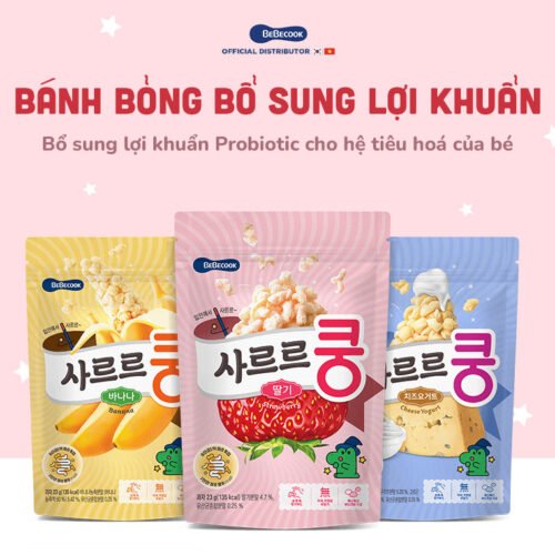 Bánh bỏng bổ sung lợi khuẩn BeBecook cho bé 12 tháng tuổi có nhiều hương vị từ hoa quả xuất xứ Hàn Quốc giúp trẻ dễ dàng hấp thụ 23gr/gói. Bánh ăn dặm BeBecook được sản xuất từ hãng thực phẩm nổi tiếng Hàn Quốc giúp bố mẹ hoàn toàn yên tâm khi bé tập ăn